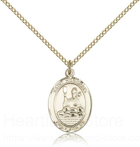 This St. Honorius Pendant is made of gold filled and is approximately the size of a nickel. The jewelry pendant is paired with an 18 inch gold filled light curb chain as pictured. All medals are gift boxed in a beautiful blue velvet hinged jewelry gift box.