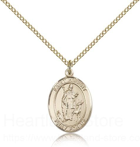 This St. Hubert of Liege Pendant is made of gold filled and is approximately the size of a nickel. The jewelry pendant is paired with an 18 inch gold filled light curb chain as pictured. All medals are gift boxed in a beautiful blue velvet hinged jewelry gift box.