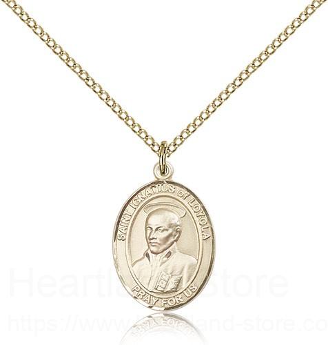 This St. Ignatius of Loyola Pendant is made of gold filled and is approximately the size of a nickel. The jewelry pendant is paired with an 18 inch gold filled light curb chain as pictured. All medals are gift boxed in a beautiful blue velvet hinged jewelry gift box.