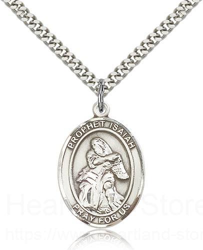This St. Isaiah Pendant is made of sterling silver and is approximately the size of a quarter. The jewelry pendant is paired with a 24 inch stainless steel heavy curb chain as pictured. All medals are gift boxed in a beautiful blue velvet hinged jewelry gift box.