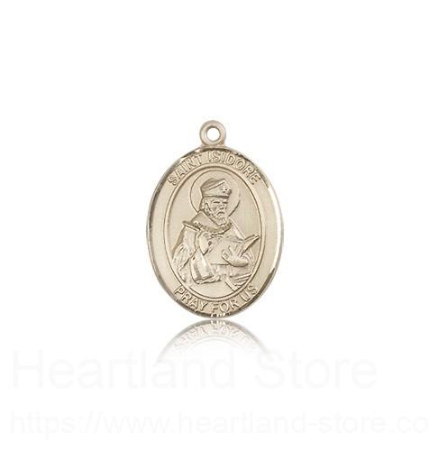 This St. Isidore of Seville Pendant is made of 14 Karat Gold and is approximately the size of a nickel. The jewelry pendant is sold individually and does not come with a chain. All medals are gift boxed in a beautiful blue velvet hinged jewelry gift box.
