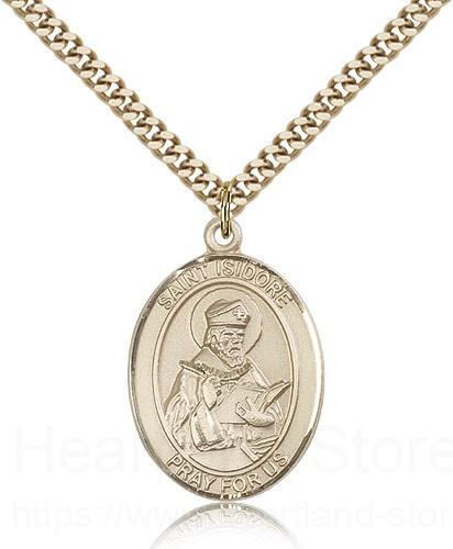 This St. Isidore of Seville Pendant is made of gold filled and is approximately the size of a quarter. The jewelry pendant is paired with a 24 inch gold filled heavy curb chain as pictured. All medals are gift boxed in a beautiful blue velvet hinged jewelry gift box.