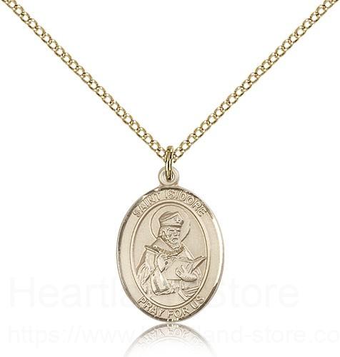 This St. Isidore of Seville Pendant is made of gold filled and is approximately the size of a nickel. The jewelry pendant is paired with an 18 inch gold filled light curb chain as pictured. All medals are gift boxed in a beautiful blue velvet hinged jewelry gift box.