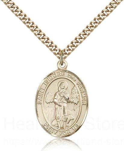This St. Isidore the Farmer Pendant is made of gold filled and is approximately the size of a quarter. The jewelry pendant is paired with a 24 inch gold filled heavy curb chain as pictured. All medals are gift boxed in a beautiful blue velvet hinged jewelry gift box.