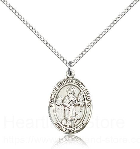 This St. Isidore the Farmer Pendant is made of sterling silver and is approximately the size of a nickel. The jewelry pendant is paired with an 18 inch sterling silver light curb chain as pictured. All medals are gift boxed in a beautiful blue velvet hinged jewelry gift box.