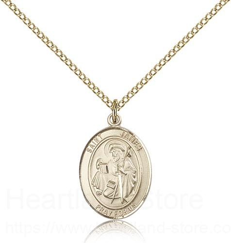 St. James the Greater Medal This St. James the Greater Pendant is made of gold filled and is approximately the size of a nickel. The jewelry pendant is paired with an 18 inch gold filled light curb chain as pictured. All medals are gift boxed in a beautiful blue velvet hinged jewelry gift box.
