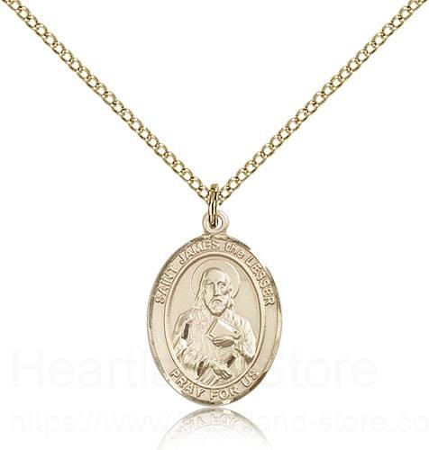 St. James the Lesser Medal This St. James the Lesser Pendant is made of gold filled and is approximately the size of a nickel. The jewelry pendant is paired with an 18 inch gold filled light curb chain as pictured. All medals are gift boxed in a beautiful blue velvet hinged jewelry gift box.