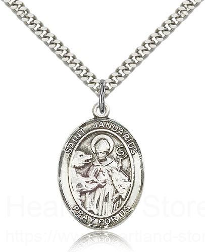 St. Januarius Medal This St. Januarius Pendant is made of sterling silver and is approximately the size of a quarter. The jewelry pendant is paired with a 24 inch stainless steel heavy curb chain as pictured. All medals are gift boxed in a beautiful blue velvet hinged jewelry gift box.