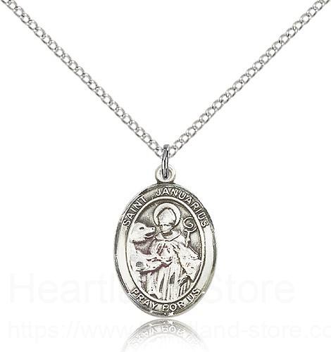 St. Januarius Medal This St. Januarius Pendant is made of sterling silver and is approximately the size of a nickel. The jewelry pendant is paired with an 18 inch sterling silver light curb chain as pictured. All medals are gift boxed in a beautiful blue velvet hinged jewelry gift box.