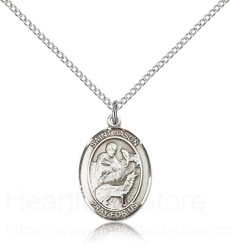 St. Jason Medal This St. Jason Pendant is made of sterling silver and is approximately the size of a nickel. The jewelry pendant is paired with an 18 inch sterling silver light curb chain as pictured. All medals are gift boxed in a beautiful blue velvet hinged jewelry gift box.