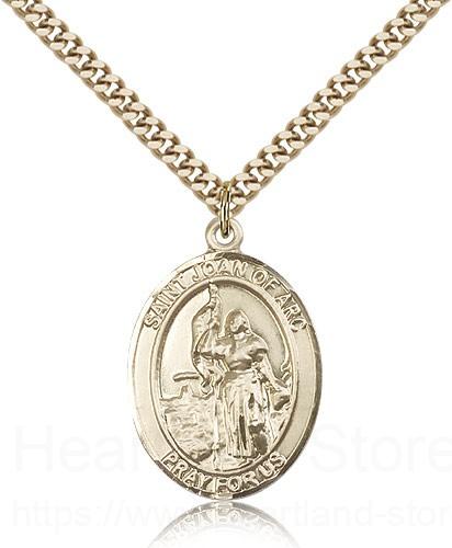 St. Joan of Arc Medal This St. Joan of Arc Pendant is made of gold filled and is approximately the size of a quarter. The jewelry pendant is paired with a 24 inch gold filled heavy curb chain as pictured. All medals are gift boxed in a beautiful blue velvet hinged jewelry gift box.