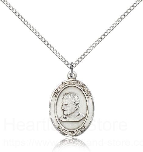 St. John Bosco Medal This St. John Bosco Pendant is made of sterling silver and is approximately the size of a nickel. The jewelry pendant is paired with an 18 inch sterling silver light curb chain as pictured. All medals are gift boxed in a beautiful blue velvet hinged jewelry gift box.