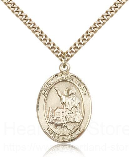 This St. John Licci Pendant is made of gold filled and is approximately the size of a quarter. The jewelry pendant is paired with a 24 inch gold filled heavy curb chain as pictured. All medals are gift boxed in a beautiful blue velvet hinged jewelry gift box.