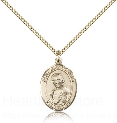 St. John Neumann Medal This St. John Neumann Pendant is made of gold filled and is approximately the size of a nickel. The jewelry pendant is paired with an 18 inch gold filled light curb chain as pictured. All medals are gift boxed in a beautiful blue velvet hinged jewelry gift box.