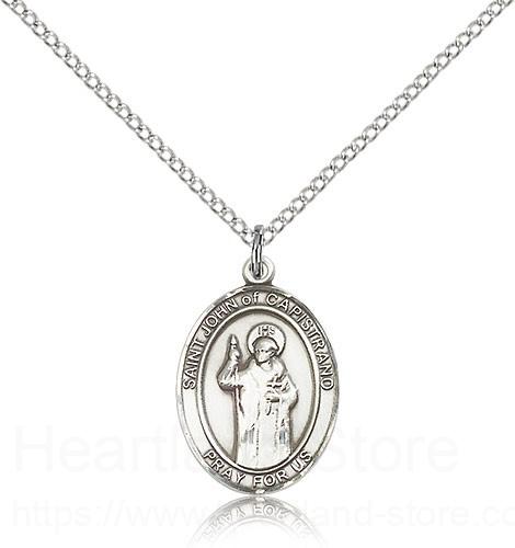 This St. John of Capistrano Pendant is made of sterling silver and is approximately the size of a nickel. The jewelry pendant is paired with an 18 inch sterling silver light curb chain as pictured. All medals are gift boxed in a beautiful blue velvet hinged jewelry gift box.