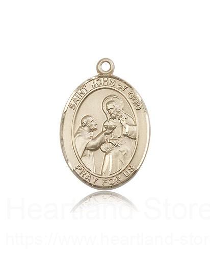 St. John of God Medal This St. John of God Pendant is made of 14 Karat Gold and is approximately the size of a quarter. The jewelry pendant is sold individually and does not come with a chain. All medals are gift boxed in a beautiful blue velvet hinged jewelry gift box.