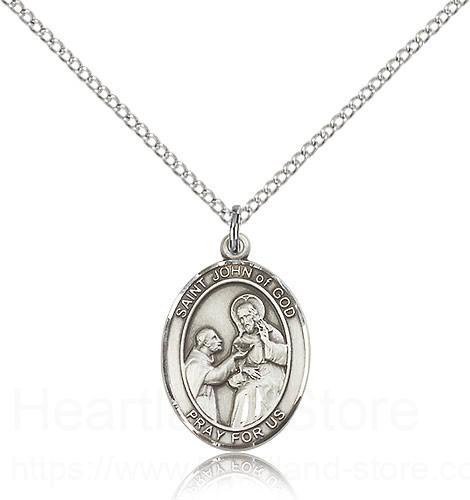 St. John of God Medal This St. John of God Pendant is made of sterling silver and is approximately the size of a nickel. The jewelry pendant is paired with an 18 inch sterling silver light curb chain as pictured. All medals are gift boxed in a beautiful blue velvet hinged jewelry gift box.