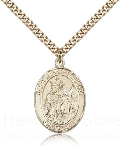 St. John the Baptist Medal This St. John the Baptist Pendant is made of gold filled and is approximately the size of a quarter. The jewelry pendant is paired with a 24 inch gold filled heavy curb chain as pictured. All medals are gift boxed in a beautiful blue velvet hinged jewelry gift box.