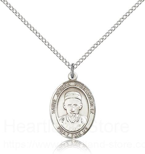 St. Joseph Freinademetz Medal This St. Joseph Freinademetz Pendant is made of sterling silver and is approximately the size of a nickel. The jewelry pendant is paired with an 18 inch sterling silver light curb chain as pictured. All medals are gift boxed in a beautiful blue velvet hinged jewelry gift box.