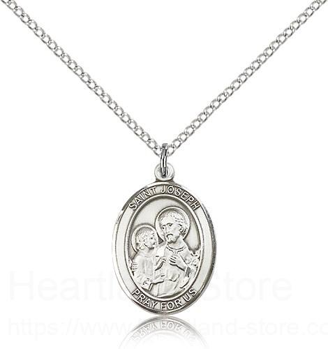 St. Joseph Medal This St. Joseph Pendant is made of sterling silver and is approximately the size of a nickel. The jewelry pendant is paired with an 18 inch sterling silver light curb chain as pictured. All medals are gift boxed in a beautiful blue velvet hinged jewelry gift box.
