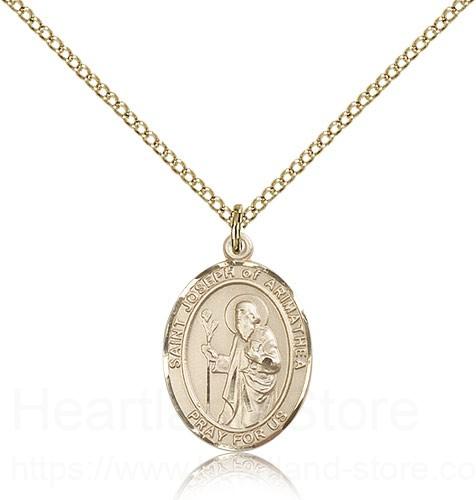 St. Joseph of Arimathea Medal This St. Joseph of Arimathea Pendant is made of gold filled and is approximately the size of a nickel. The jewelry pendant is paired with an 18 inch gold filled light curb chain as pictured. All medals are gift boxed in a beautiful blue velvet hinged jewelry gift box.