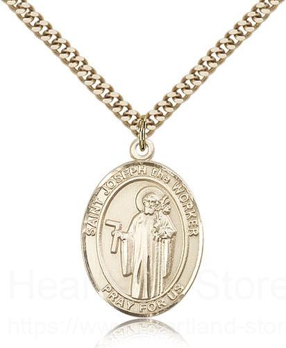 St. Joseph the Worker Medal This St. Joseph the Worker Pendant is made of gold filled and is approximately the size of a quarter. The jewelry pendant is paired with a 24 inch gold filled heavy curb chain as pictured. All medals are gift boxed in a beautiful blue velvet hinged jewelry gift box.
