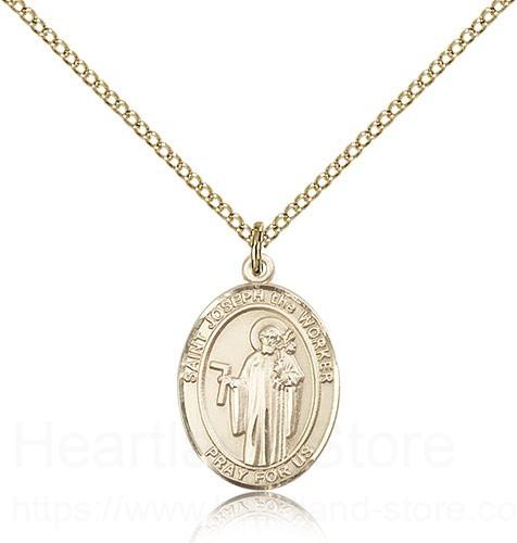St. Joseph the Worker Medal This St. Joseph the Worker Pendant is made of gold filled and is approximately the size of a nickel. The jewelry pendant is paired with an 18 inch gold filled light curb chain as pictured. All medals are gift boxed in a beautiful blue velvet hinged jewelry gift box.