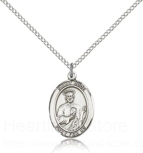This St. Jude Thaddeus Pendant is made of sterling silver and is approximately the size of a nickel. The jewelry pendant is paired with an 18 inch sterling silver light curb chain as pictured. All medals are gift boxed in a beautiful blue velvet hinged jewelry gift box.