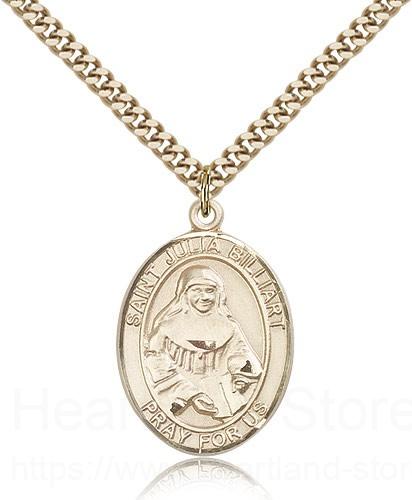 This St. Julia Billiart Pendant is made of gold filled and is approximately the size of a quarter. The jewelry pendant is paired with a 24 inch gold filled heavy curb chain as pictured. All medals are gift boxed in a beautiful blue velvet hinged jewelry gift box.