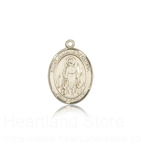 This St. Juliana Pendant is made of 14 Karat Gold and is approximately the size of a nickel. The jewelry pendant is sold individually and does not come with a chain. All medals are gift boxed in a beautiful blue velvet hinged jewelry gift box.