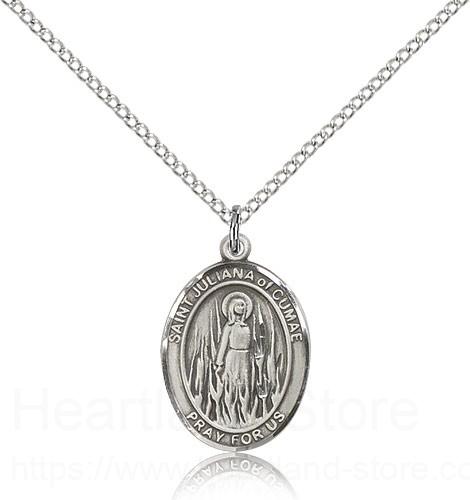 This St. Juliana Pendant is made of sterling silver and is approximately the size of a nickel. The jewelry pendant is paired with an 18 inch sterling silver light curb chain as pictured. All medals are gift boxed in a beautiful blue velvet hinged jewelry gift box.