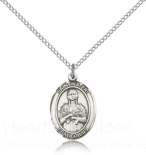 This St. Kateri Pendant is made of sterling silver and is approximately the size of a nickel. The jewelry pendant is paired with an 18 inch sterling silver light curb chain as pictured. All medals are gift boxed in a beautiful blue velvet hinged jewelry gift box.