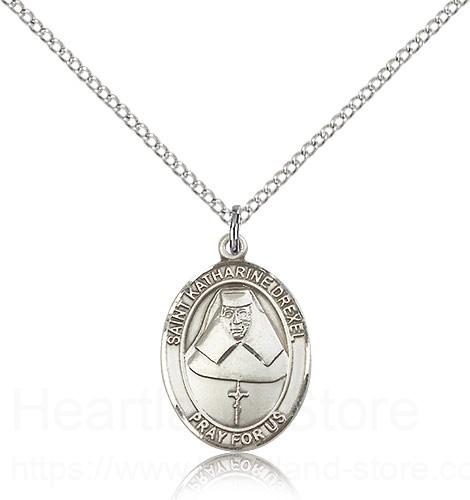 This St. Katharine Drexel Pendant is made of sterling silver and is approximately the size of a nickel. The jewelry pendant is paired with an 18 inch sterling silver light curb chain as pictured. All medals are gift boxed in a beautiful blue velvet hinged jewelry gift box.