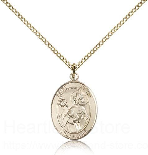 This St. Kevin Pendant is made of gold filled and is approximately the size of a nickel. The jewelry pendant is paired with an 18 inch gold filled light curb chain as pictured. All medals are gift boxed in a beautiful blue velvet hinged jewelry gift box.