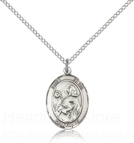 This St. Kevin Pendant is made of sterling silver and is approximately the size of a nickel. The jewelry pendant is paired with an 18 inch sterling silver light curb chain as pictured. All medals are gift boxed in a beautiful blue velvet hinged jewelry gift box.