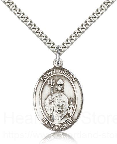 This St. Kilian Pendant is made of sterling silver and is approximately the size of a quarter. The jewelry pendant is paired with a 24 inch stainless steel heavy curb chain as pictured. All medals are gift boxed in a beautiful blue velvet hinged jewelry gift box.