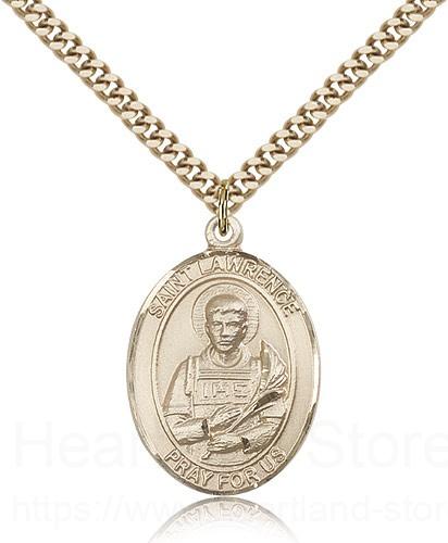 This St. Lawrence Pendant is made of gold filled and is approximately the size of a quarter. The jewelry pendant is paired with a 24 inch gold filled heavy curb chain as pictured. All medals are gift boxed in a beautiful blue velvet hinged jewelry gift box.