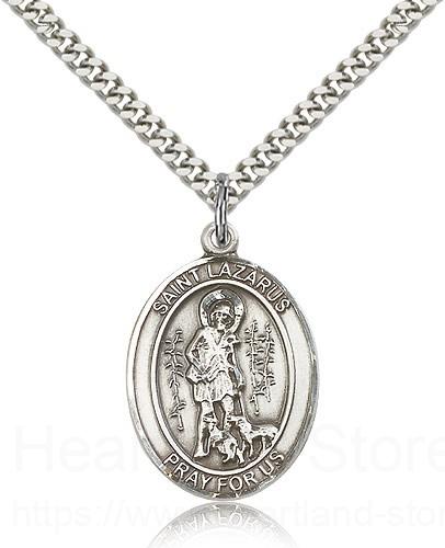 This St. Lazarus Pendant is made of sterling silver and is approximately the size of a quarter. The jewelry pendant is paired with a 24 inch stainless steel heavy curb chain as pictured. All medals are gift boxed in a beautiful blue velvet hinged jewelry gift box.