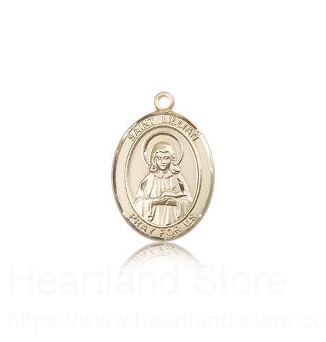 This St. Lillian Pendant is made of 14 Karat Gold and is approximately the size of a nickel. The jewelry pendant is sold individually and does not come with a chain. All medals are gift boxed in a beautiful blue velvet hinged jewelry gift box.