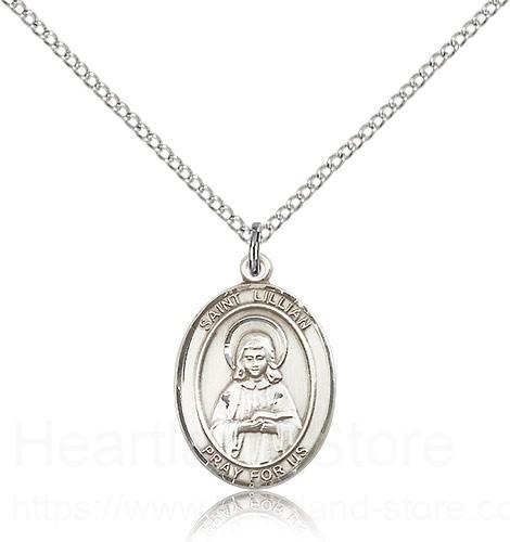 This St. Lillian Pendant is made of sterling silver and is approximately the size of a nickel. The jewelry pendant is paired with an 18 inch sterling silver light curb chain as pictured. All medals are gift boxed in a beautiful blue velvet hinged jewelry gift box.