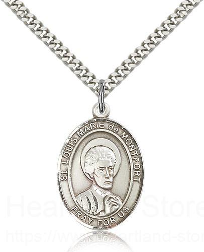 This St. Louis Marie De Montfort Pendant is made of sterling silver and is approximately the size of a quarter. The jewelry pendant is paired with a 24 inch stainless steel heavy curb chain as pictured. All medals are gift boxed in a beautiful blue velvet hinged jewelry gift box.