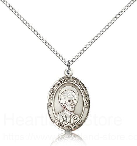This St. Louis Marie De Montfort Pendant is made of sterling silver and is approximately the size of a nickel. The jewelry pendant is paired with an 18 inch sterling silver light curb chain as pictured. All medals are gift boxed in a beautiful blue velvet hinged jewelry gift box.