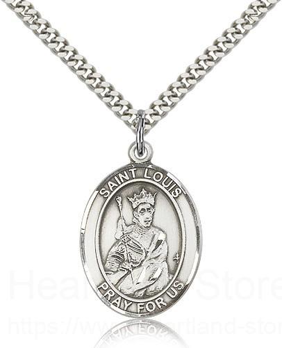 This St. Louis Pendant is made of sterling silver and is approximately the size of a quarter. The jewelry pendant is paired with a 24 inch stainless steel heavy curb chain as pictured. All medals are gift boxed in a beautiful blue velvet hinged jewelry gift box.
