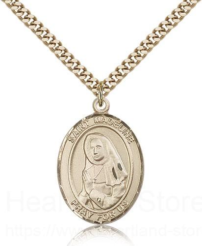 This St. Madeline Sophie Barat Pendant is made of gold filled and is approximately the size of a quarter. The jewelry pendant is paired with a 24 inch gold filled heavy curb chain as pictured. All medals are gift boxed in a beautiful blue velvet hinged jewelry gift box.