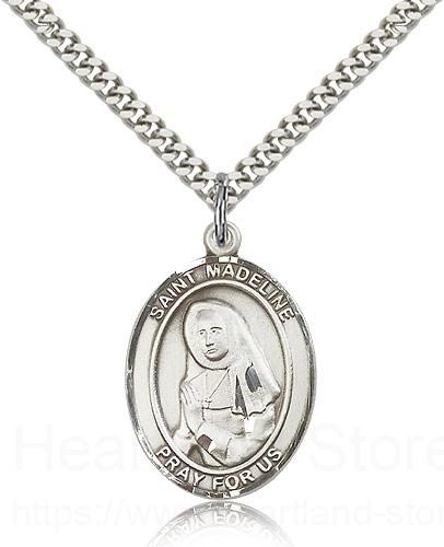 This St. Madeline Sophie Barat Pendant is made of sterling silver and is approximately the size of a quarter. The jewelry pendant is paired with a 24 inch stainless steel heavy curb chain as pictured. All medals are gift boxed in a beautiful blue velvet hinged jewelry gift box.