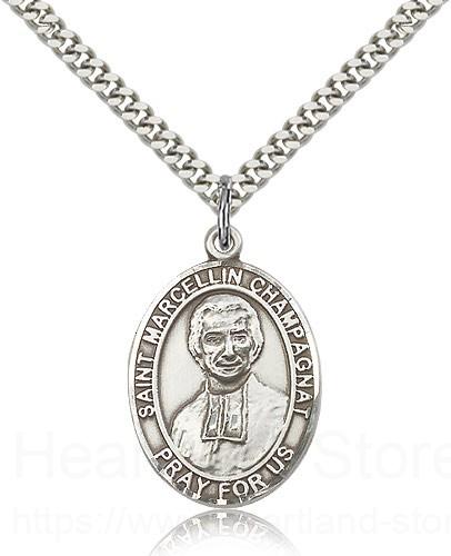 This St. Marcellin Champagnat Pendant is made of sterling silver and is approximately the size of a quarter. The jewelry pendant is paired with a 24 inch stainless steel heavy curb chain as pictured. All medals are gift boxed in a beautiful blue velvet hinged jewelry gift box.