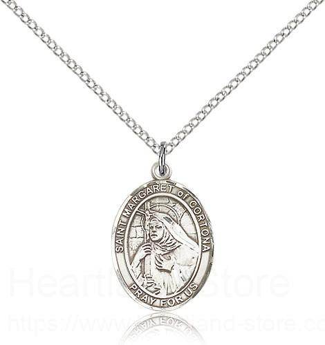 This St. Margaret of Cortona Pendant is made of sterling silver and is approximately the size of a nickel. The jewelry pendant is paired with an 18 inch sterling silver light curb chain as pictured. All medals are gift boxed in a beautiful blue velvet hinged jewelry gift box.