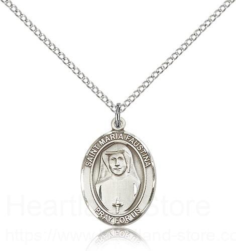 This St. Maria Faustina Pendant is made of sterling silver and is approximately the size of a nickel. The jewelry pendant is paired with an 18 inch sterling silver light curb chain as pictured. All medals are gift boxed in a beautiful blue velvet hinged jewelry gift box.