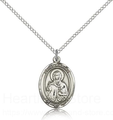 This St. Marina Pendant is made of sterling silver and is approximately the size of a nickel. The jewelry pendant is paired with an 18 inch sterling silver light curb chain as pictured. All medals are gift boxed in a beautiful blue velvet hinged jewelry gift box.
