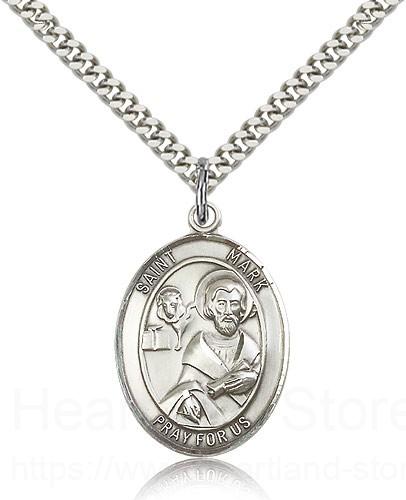 This St. Mark the Evangelist Pendant is made of sterling silver and is approximately the size of a quarter. The jewelry pendant is paired with a 24 inch stainless steel heavy curb chain as pictured. All medals are gift boxed in a beautiful blue velvet hinged jewelry gift box.